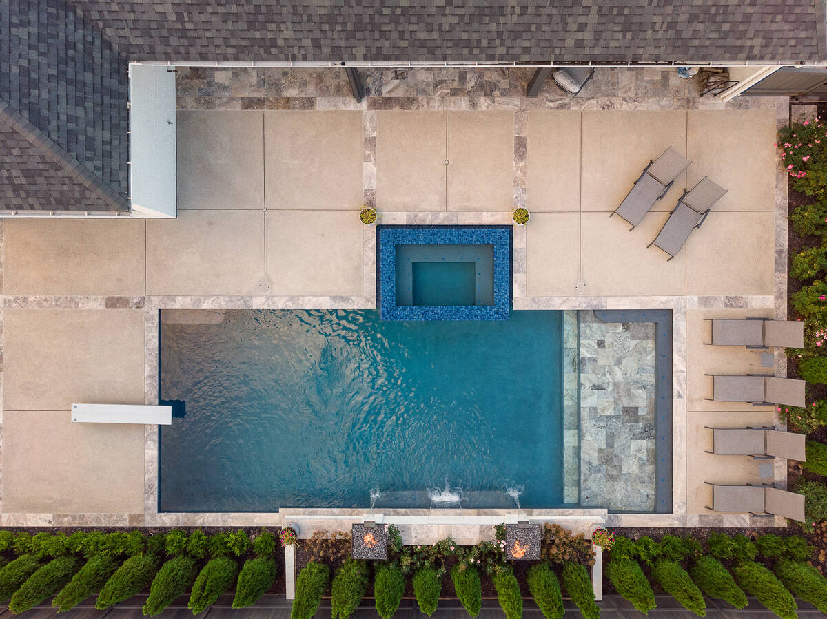The Curran project blends modern elegance with resort-style comfort. A sleek, glass-tile spa with a spillway seamlessly overflows into a custom gunite pool, creating a tranquil visual and auditory experience. The pool interior is finished in a smooth Riviera-color plaster, providing both comfort and a rich, inviting tone. A travertine wet deck offers a durable, refined look, while the surrounding decking is crafted from durable washed aggregate. Dramatic fire bowls, set on raised pilasters, provide warmth and evening ambiance. Lush plantings and evergreen screening ensure year-round privacy while softening the hardscape. Every element was designed with both aesthetics and engineering in mind, turning this backyard into a private luxury retreat.