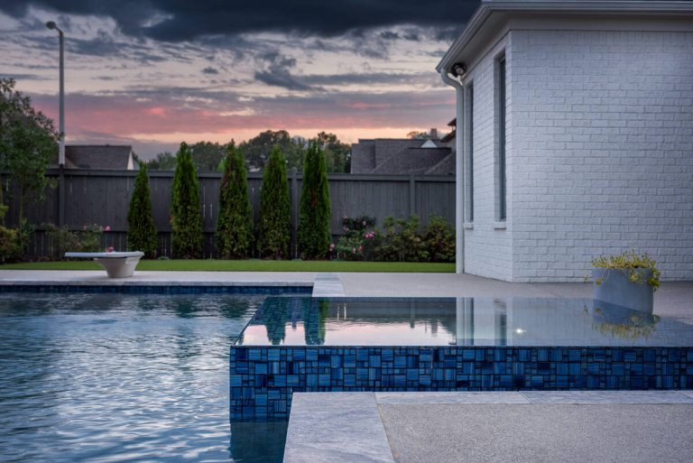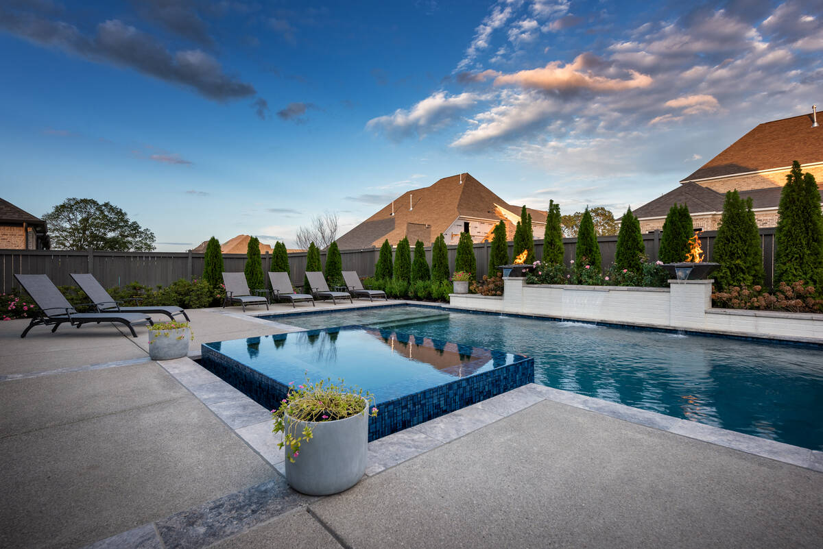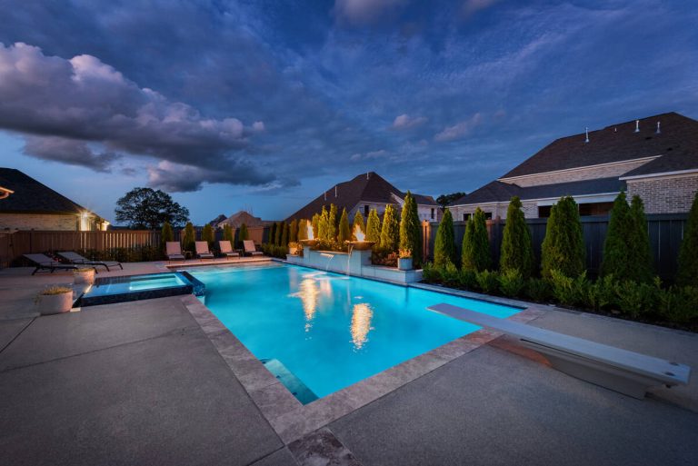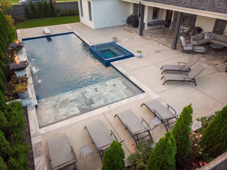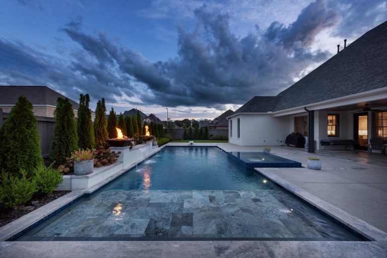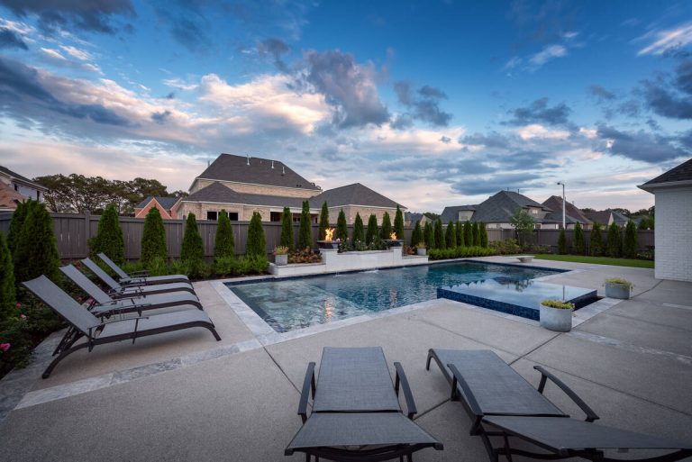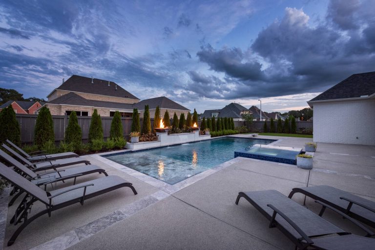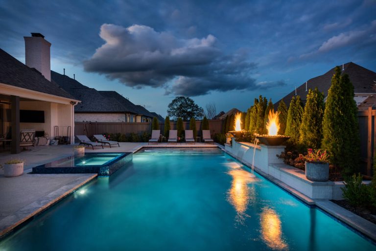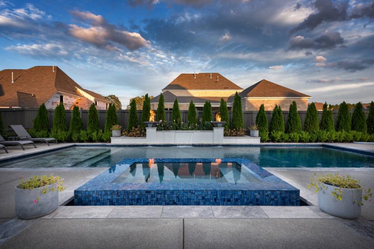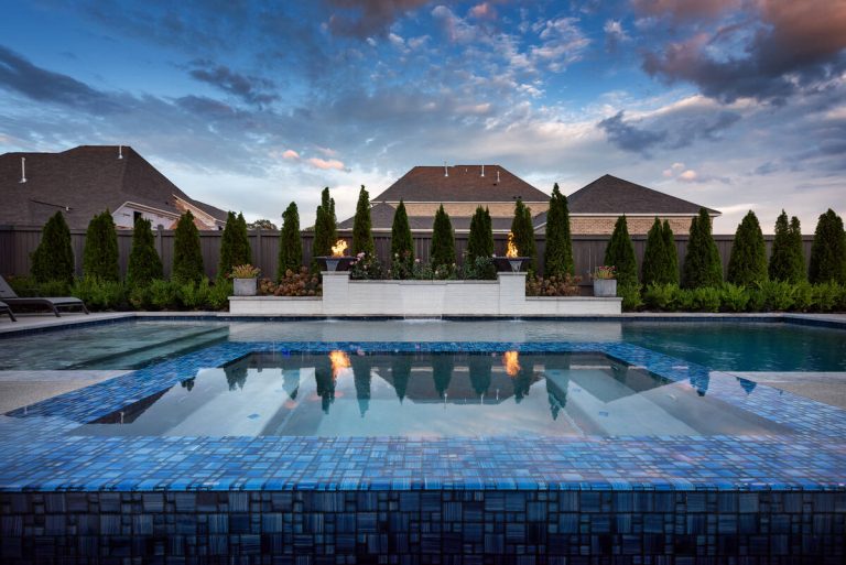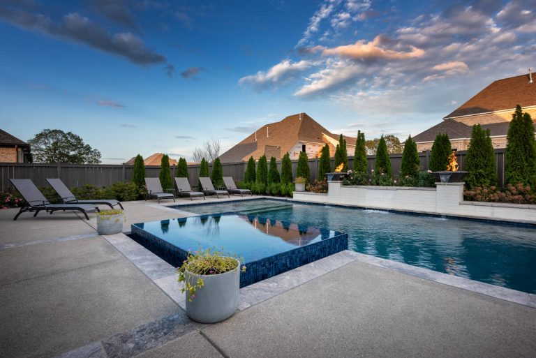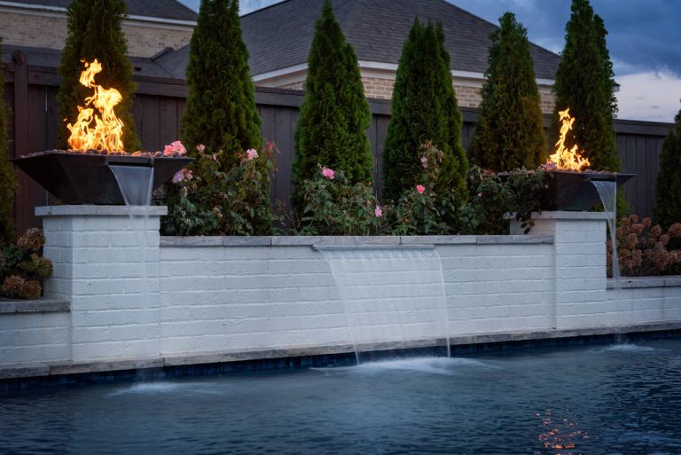 The Curran project blends modern elegance with resort-style comfort. A sleek, glass-tile spa with a spillway seamlessly overflows into a custom gunite pool, creating a tranquil visual and auditory experience. The pool interior is finished in a smooth Riviera-color plaster, providing both comfort and a rich, inviting tone. A travertine wet deck offers a durable, refined look, while the surrounding decking is crafted from durable washed aggregate. Dramatic fire bowls, set on raised pilasters, provide warmth and evening ambiance. Lush plantings and evergreen screening ensure year-round privacy while softening the hardscape. Every element was designed with both aesthetics and engineering in mind, turning this backyard into a private luxury retreat.