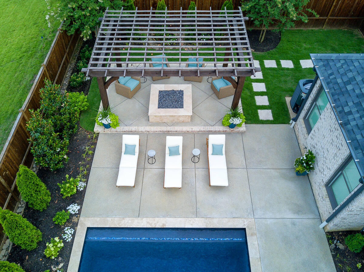 The Martin project is a showcase of outdoor living designed for both relaxation and entertainment. A custom gunite pool with a raised glass-tile spa offers a striking focal point, while the smooth plaster finish in a deep, inviting hue enhances the water’s reflective beauty. A travertine-topped fire feature with cascading sheers adds warmth and visual drama, framed by lush arborvitaes, and evergreen screening for year-round privacy. Surrounding the pool, durable washed aggregate decking ensures lasting performance, leading to a fully equipped outdoor kitchen with built-in grill, smoker, and ample counter space. A pergola-covered seating area with a central fire pit creates an inviting destination for evening gatherings. Every detail of this project blends craftsmanship and comfort, transforming the backyard into a complete resort experience.