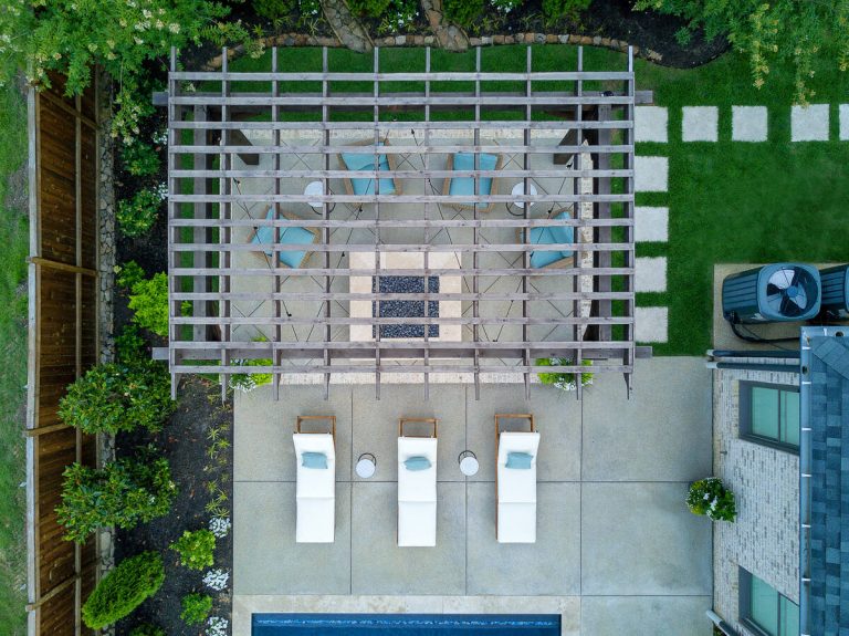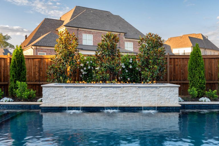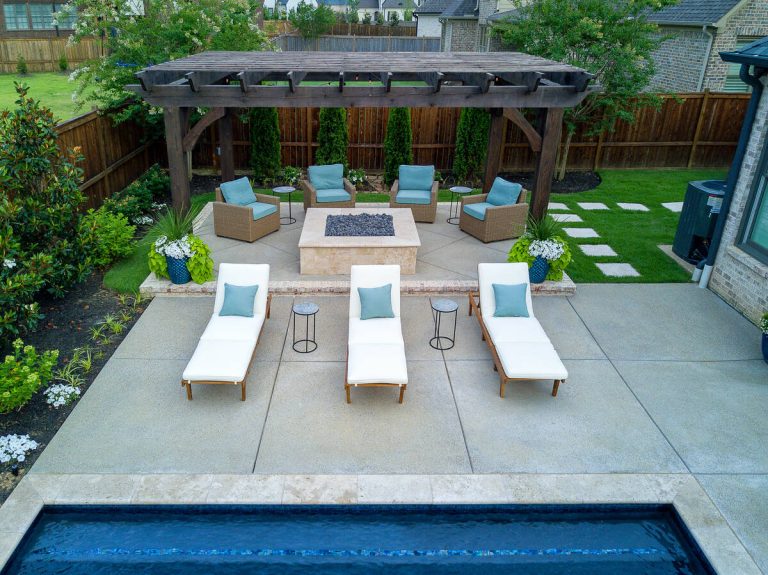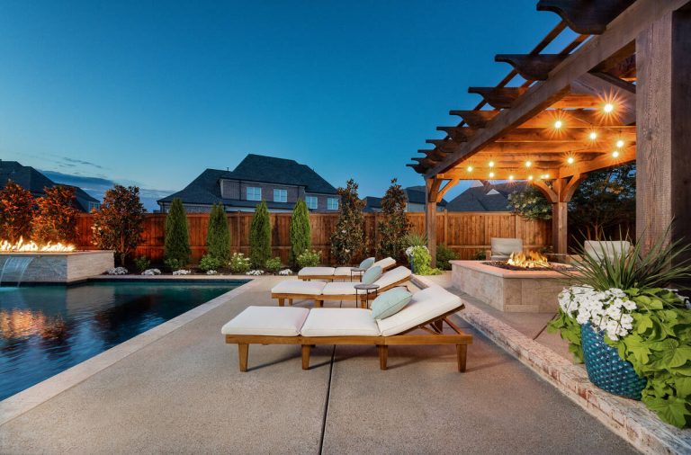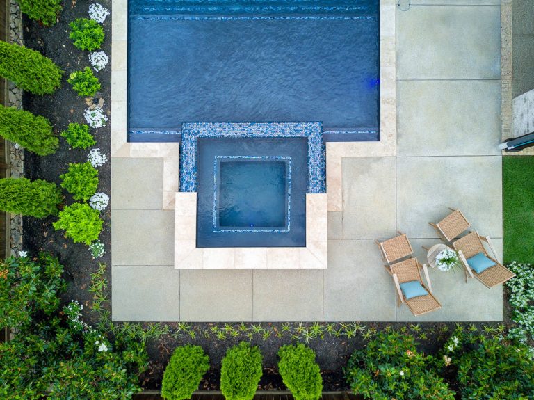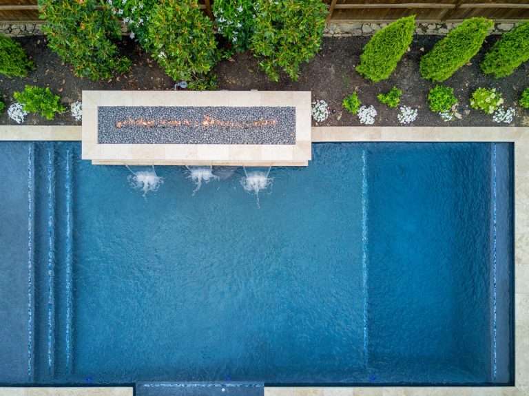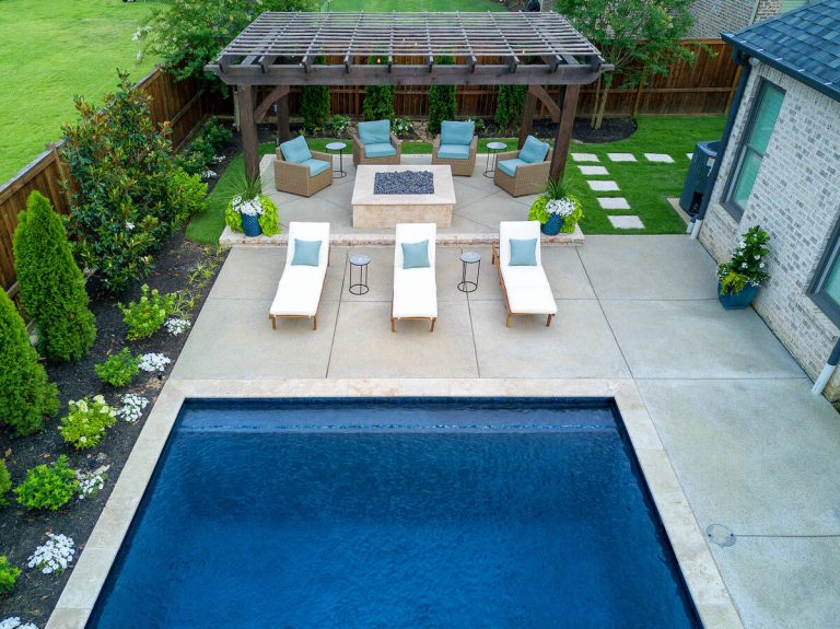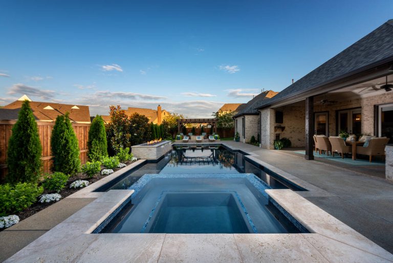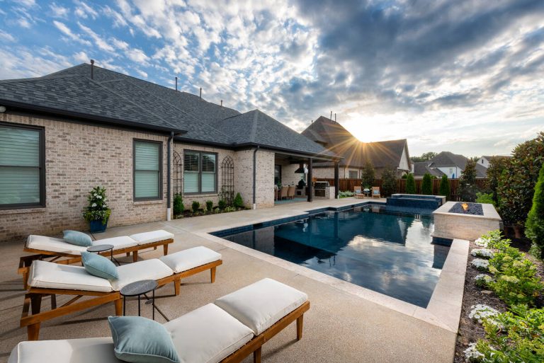 The Martin project is a showcase of outdoor living designed for both relaxation and entertainment. A custom gunite pool with a raised glass-tile spa offers a striking focal point, while the smooth plaster finish in a deep, inviting hue enhances the water’s reflective beauty. A travertine-topped fire feature with cascading sheers adds warmth and visual drama, framed by lush arborvitaes, and evergreen screening for year-round privacy. Surrounding the pool, durable washed aggregate decking ensures lasting performance, leading to a fully equipped outdoor kitchen with built-in grill, smoker, and ample counter space. A pergola-covered seating area with a central fire pit creates an inviting destination for evening gatherings. Every detail of this project blends craftsmanship and comfort, transforming the backyard into a complete resort experience.