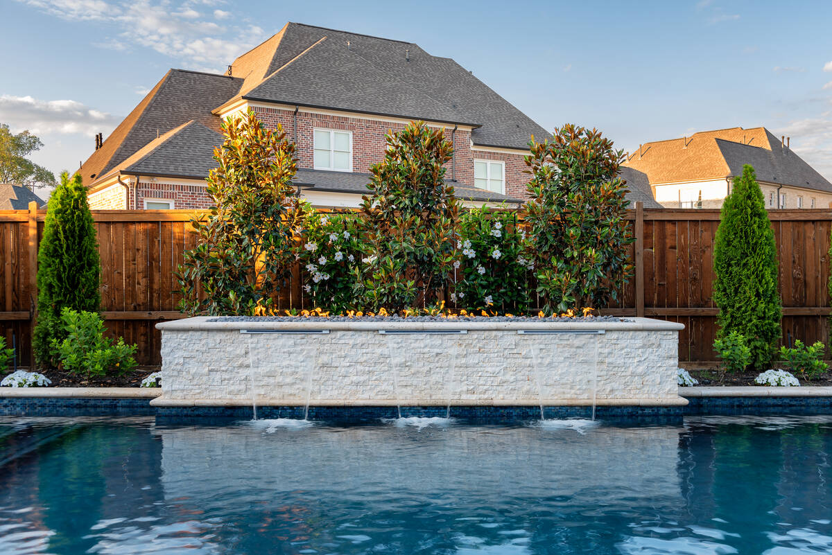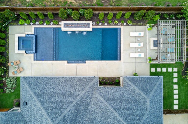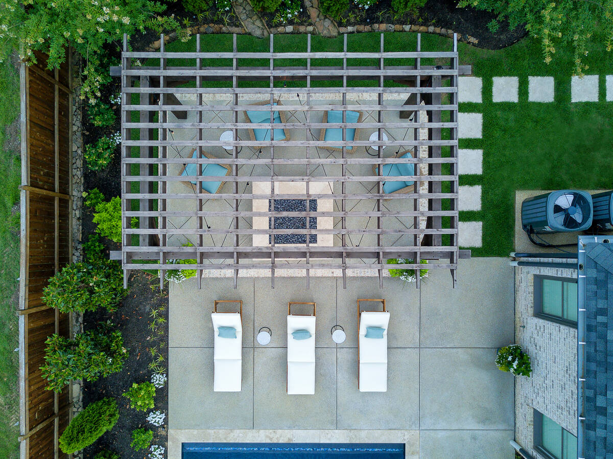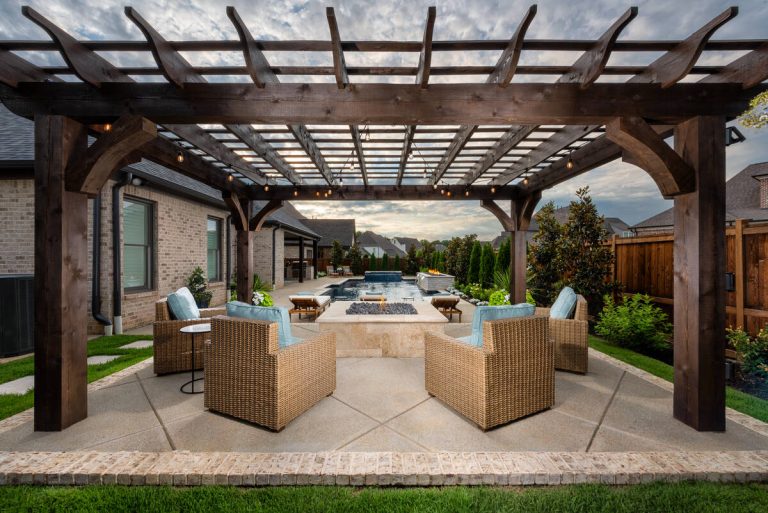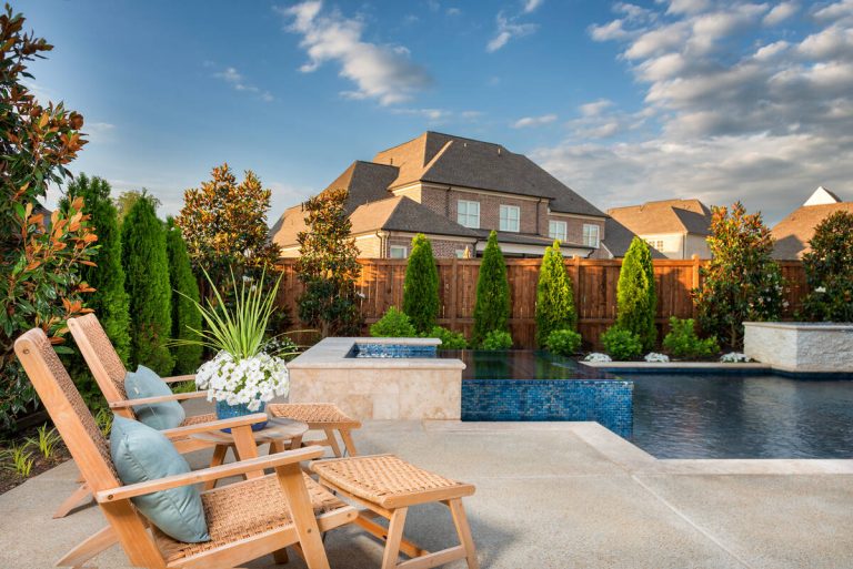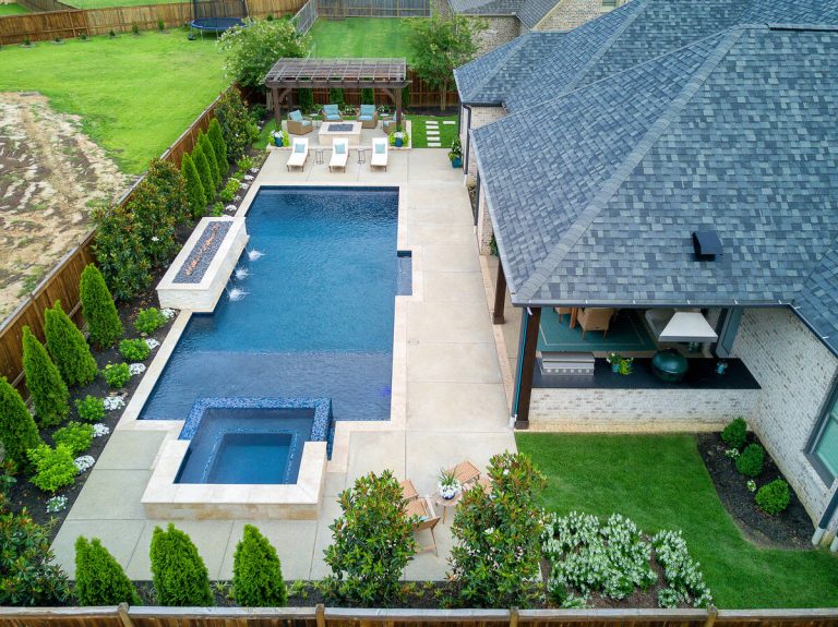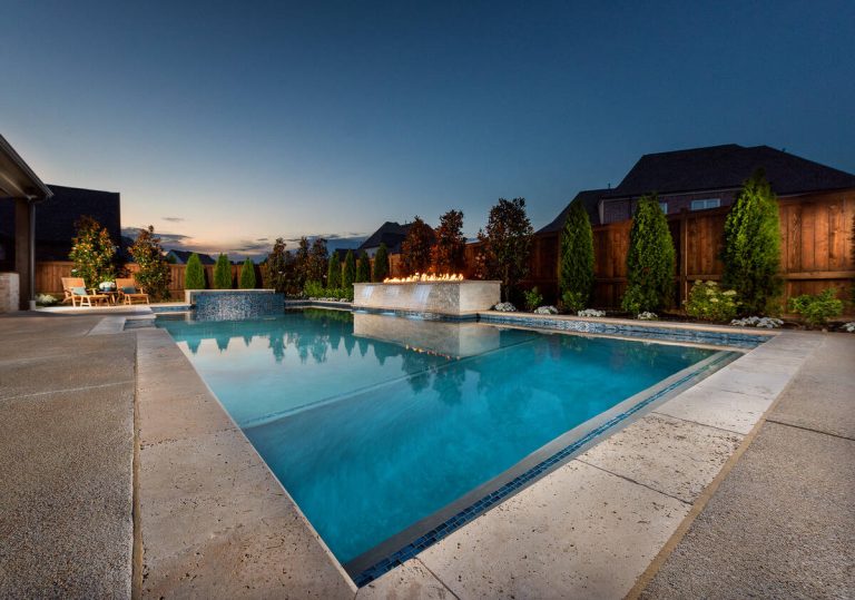The Martin project is a showcase of outdoor living designed for both relaxation and entertainment. A custom gunite pool with a raised glass-tile spa offers a striking focal point, while the smooth plaster finish in a deep, inviting hue enhances the water’s reflective beauty. A travertine-topped fire feature with cascading sheers adds warmth and visual drama, framed by lush arborvitaes, and evergreen screening for year-round privacy. Surrounding the pool, durable washed aggregate decking ensures lasting performance, leading to a fully equipped outdoor kitchen with built-in grill, smoker, and ample counter space. A pergola-covered seating area with a central fire pit creates an inviting destination for evening gatherings. Every detail of this project blends craftsmanship and comfort, transforming the backyard into a complete resort experience.