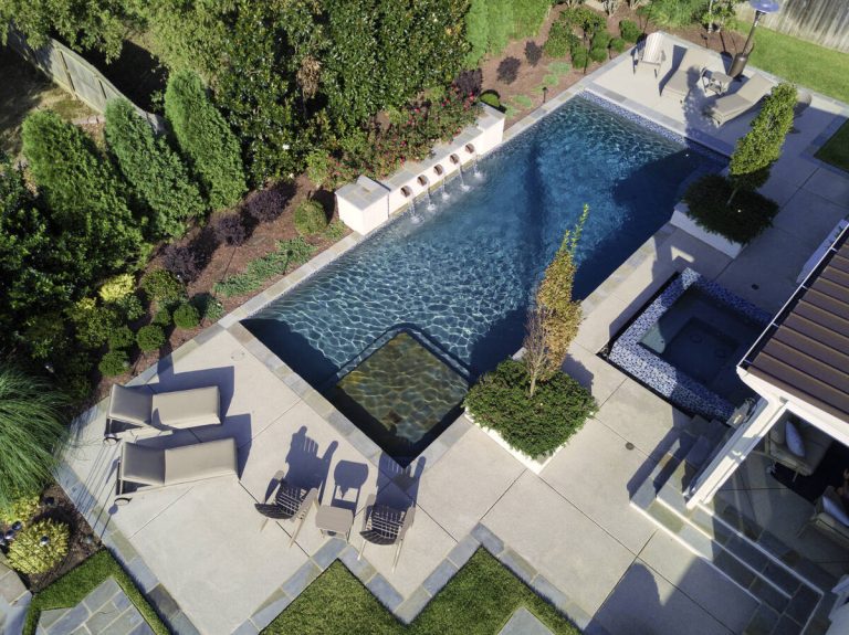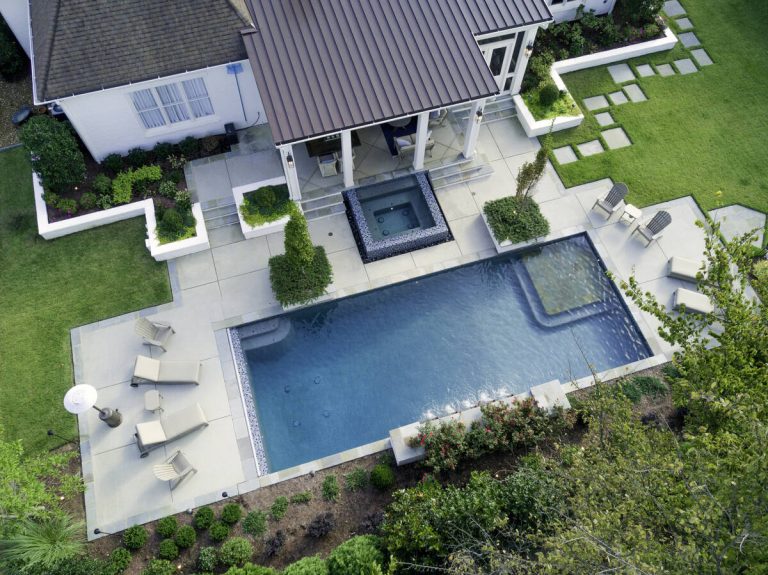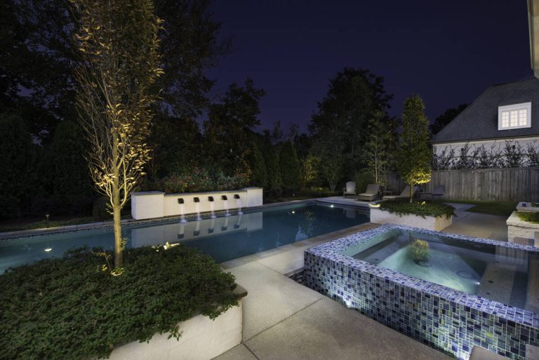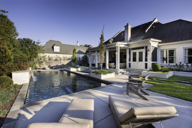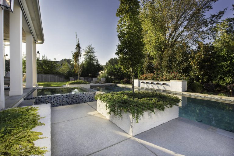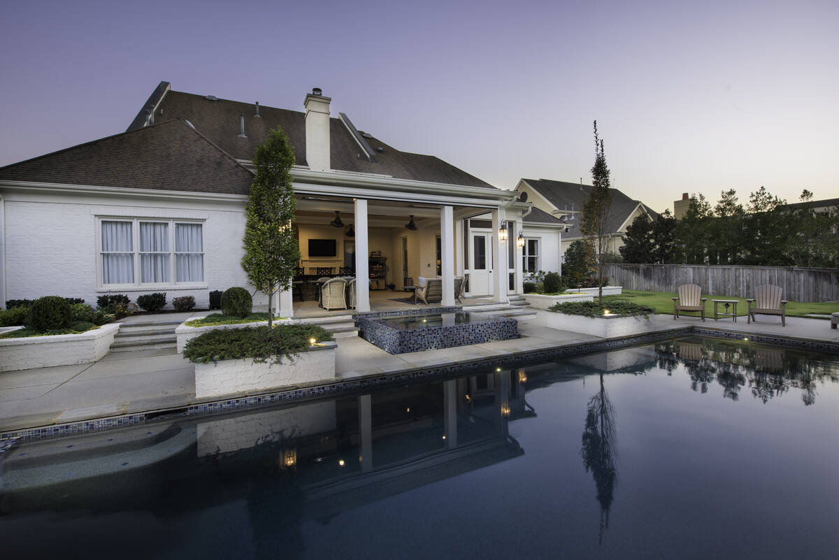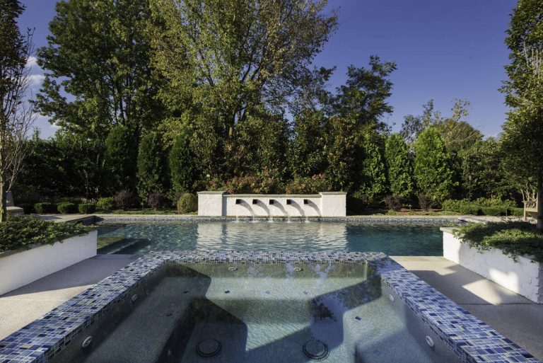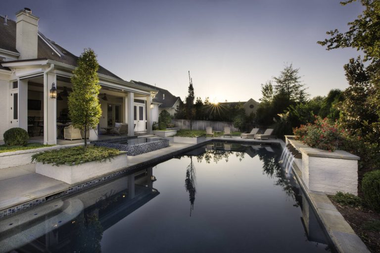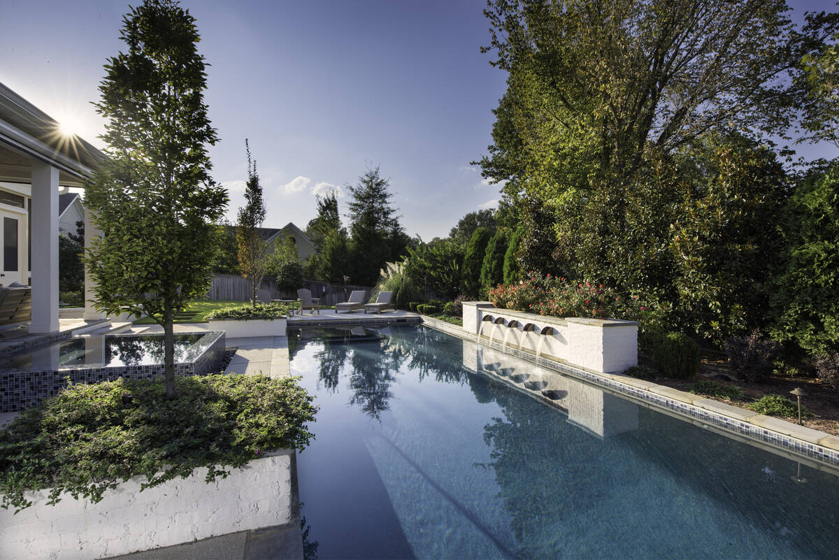 The Puryear project blends elegance and functionality in a complete backyard transformation. A custom gunite pool with a PebbleTec plaster finish offers lasting beauty and a natural, textured look, complemented by a raised spa for year-round relaxation. Copper scuppers provide a gentle, soothing water flow, while the washed limestone aggregate decking delivers a durable and stylish surface underfoot. An automatic pool cover ensures safety and convenience, extending the life of the pool with minimal maintenance. The space is anchored by a covered patio addition, creating a comfortable outdoor living area that’s perfect for dining, lounging, and entertaining. Every detail is designed for both visual impact and long-term enjoyment.