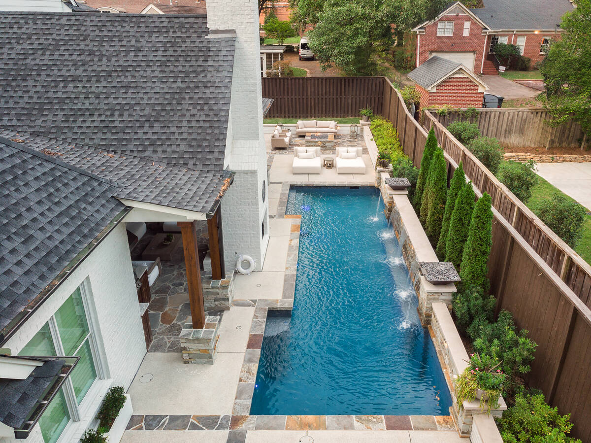 The Silverfield backyard retreat showcases a smooth plaster finish in the rich Riviera color, perfectly complemented by a raised wall faced with hand-chopped bluestone and capped with matching bluestone coping. Sleek sheer descents bring the soothing sound of falling water, while striking copper fire bowls deliver a captivating fire-and-water display. A see-through fireplace anchors the outdoor living space, creating a warm, inviting atmosphere that can be enjoyed from multiple vantage points. Every detail is thoughtfully crafted, reflecting the unmatched quality and artistry that define our work.