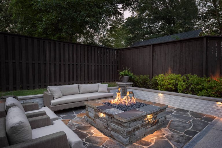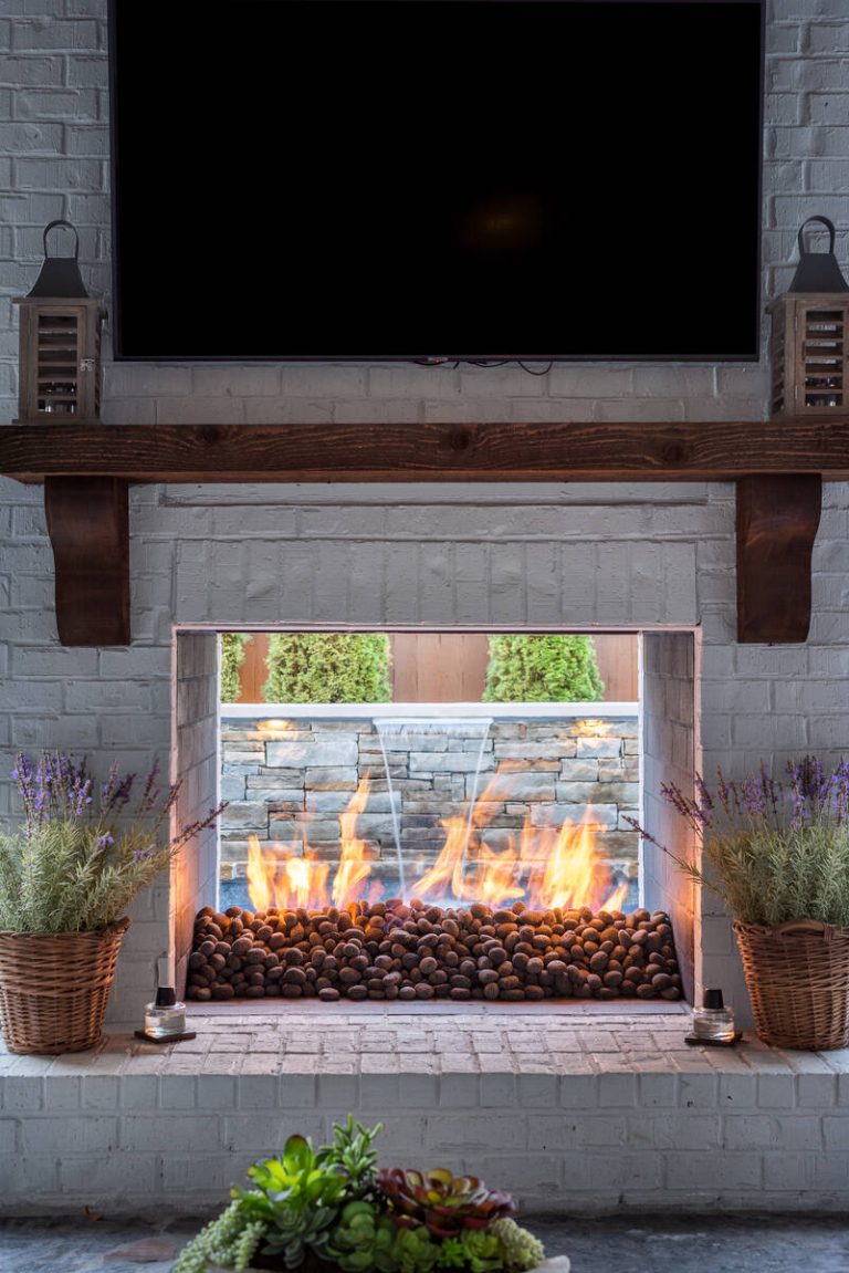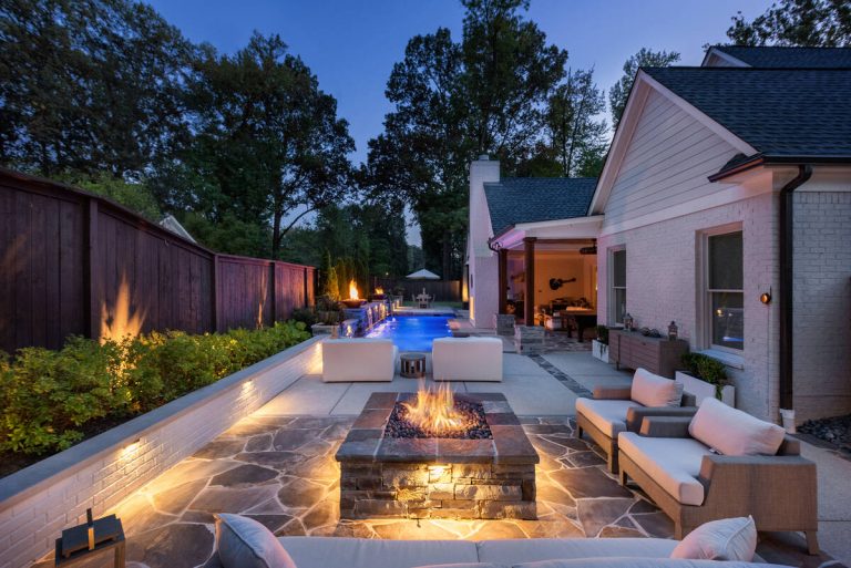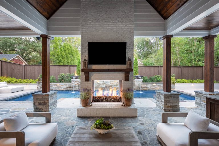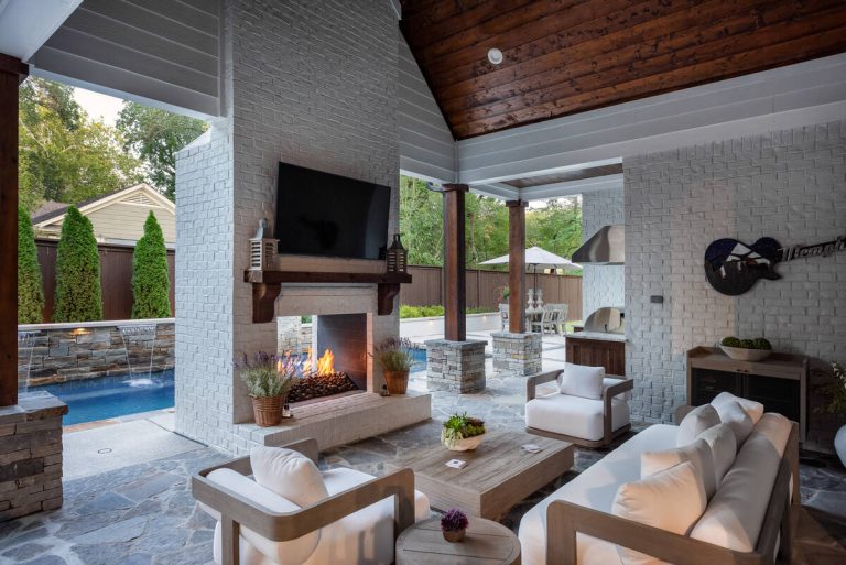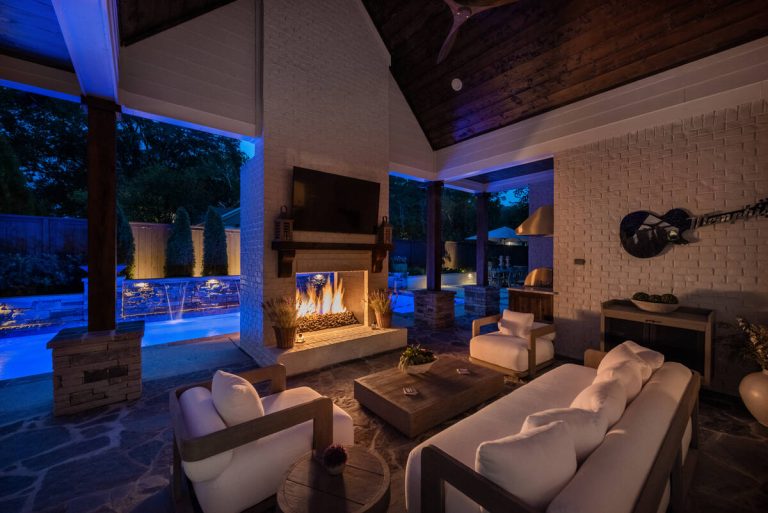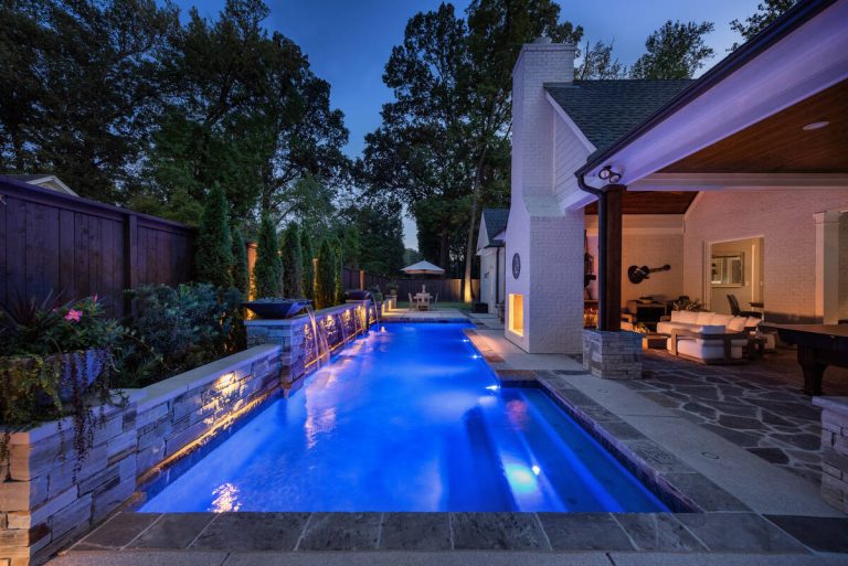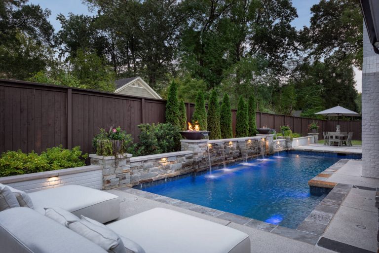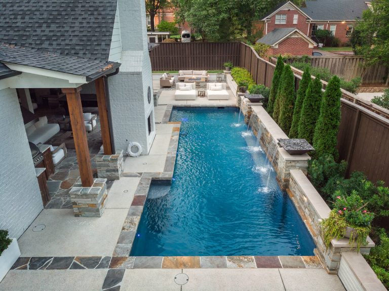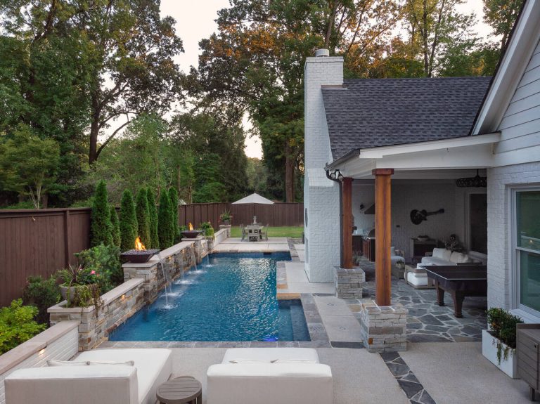 The Silverfield backyard retreat showcases a smooth plaster finish in the rich Riviera color, perfectly complemented by a raised wall faced with hand-chopped bluestone and capped with matching bluestone coping. Sleek sheer descents bring the soothing sound of falling water, while striking copper fire bowls deliver a captivating fire-and-water display. A see-through fireplace anchors the outdoor living space, creating a warm, inviting atmosphere that can be enjoyed from multiple vantage points. Every detail is thoughtfully crafted, reflecting the unmatched quality and artistry that define our work.